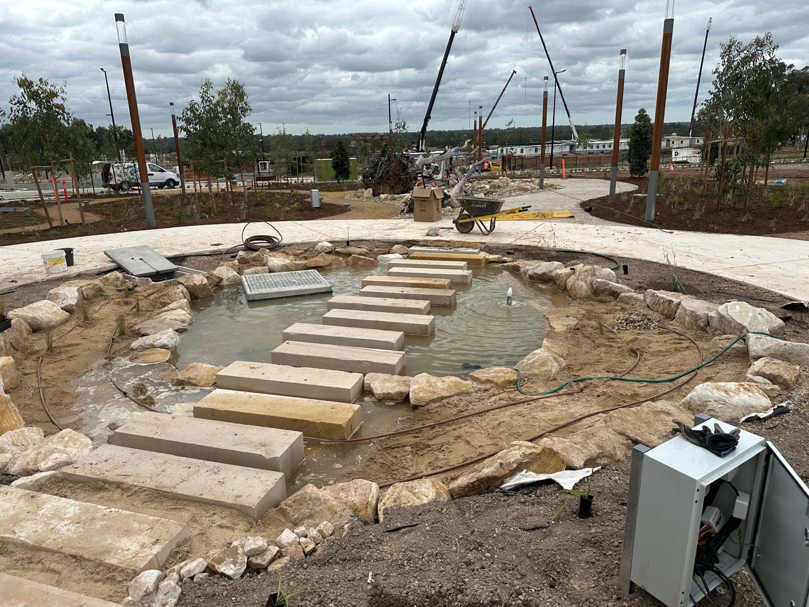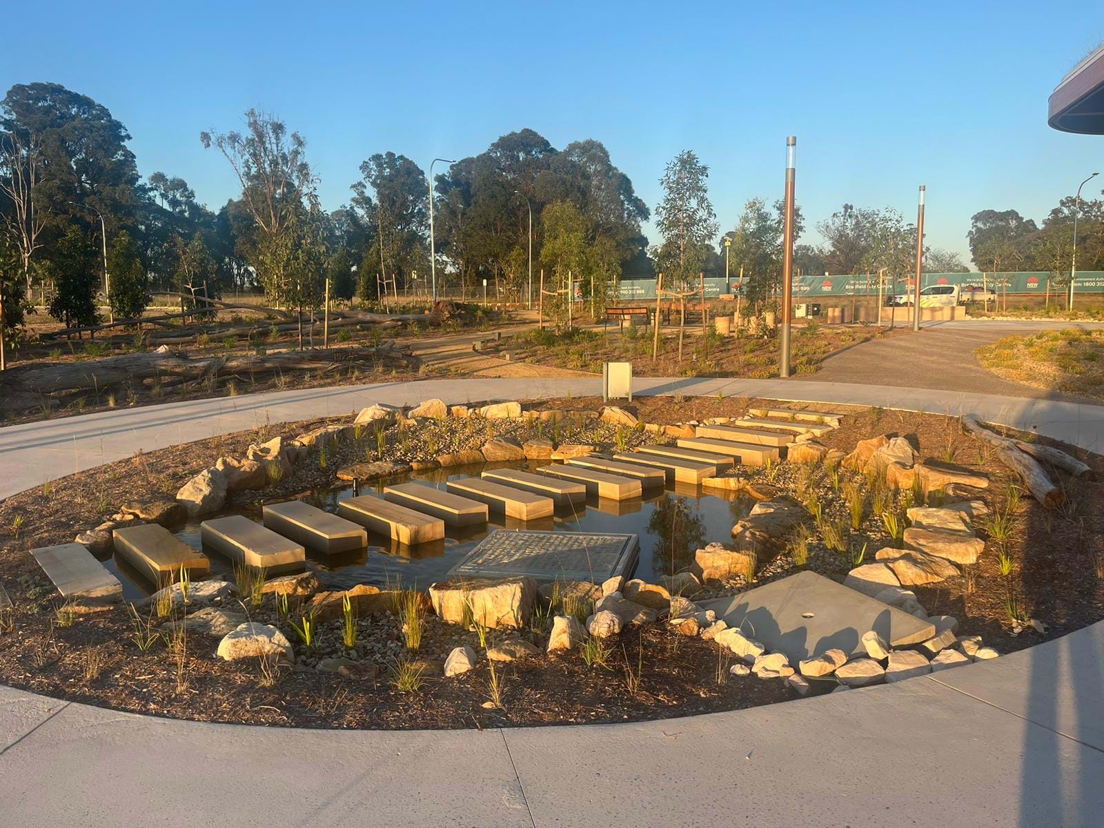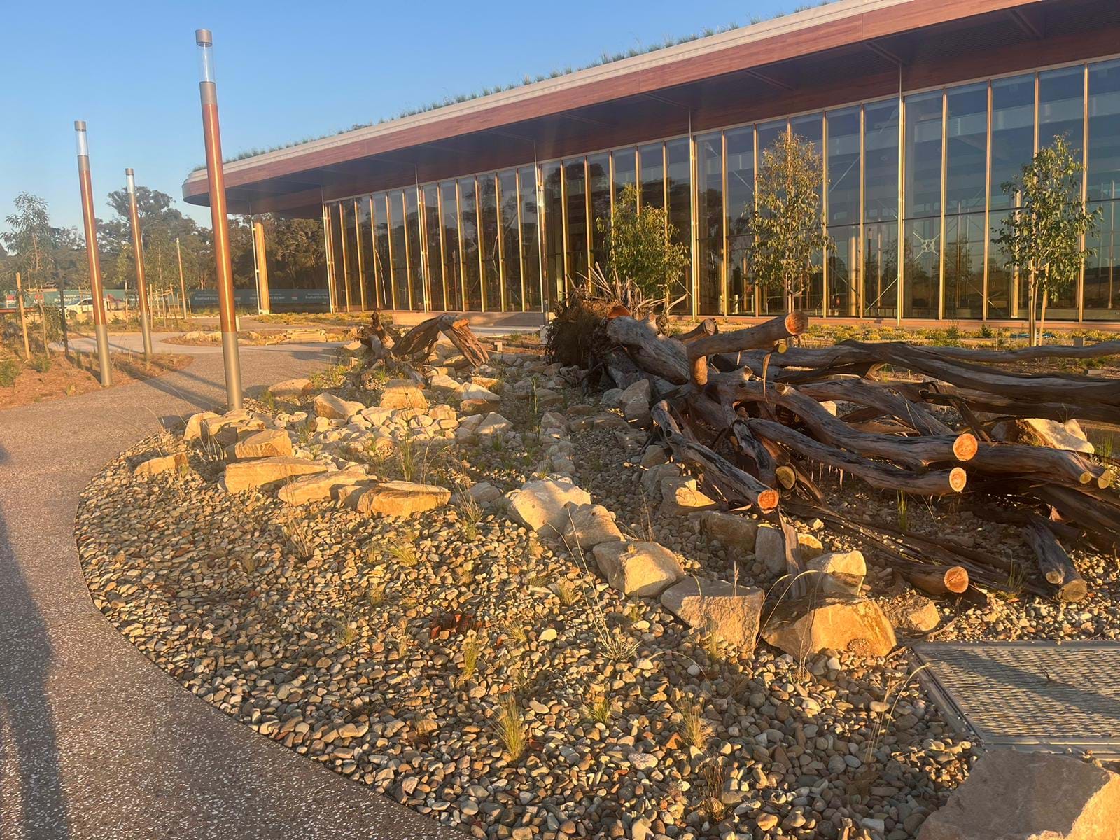 | JOB DESCRIPTION | Landscaping works for the 'First Building' in the new Bradfield City Centre consisting of mass planting over 130 native plant species through open park areas, with rammed earth seats and walls, water features, dry creek beds, planters and cultural gardens. |