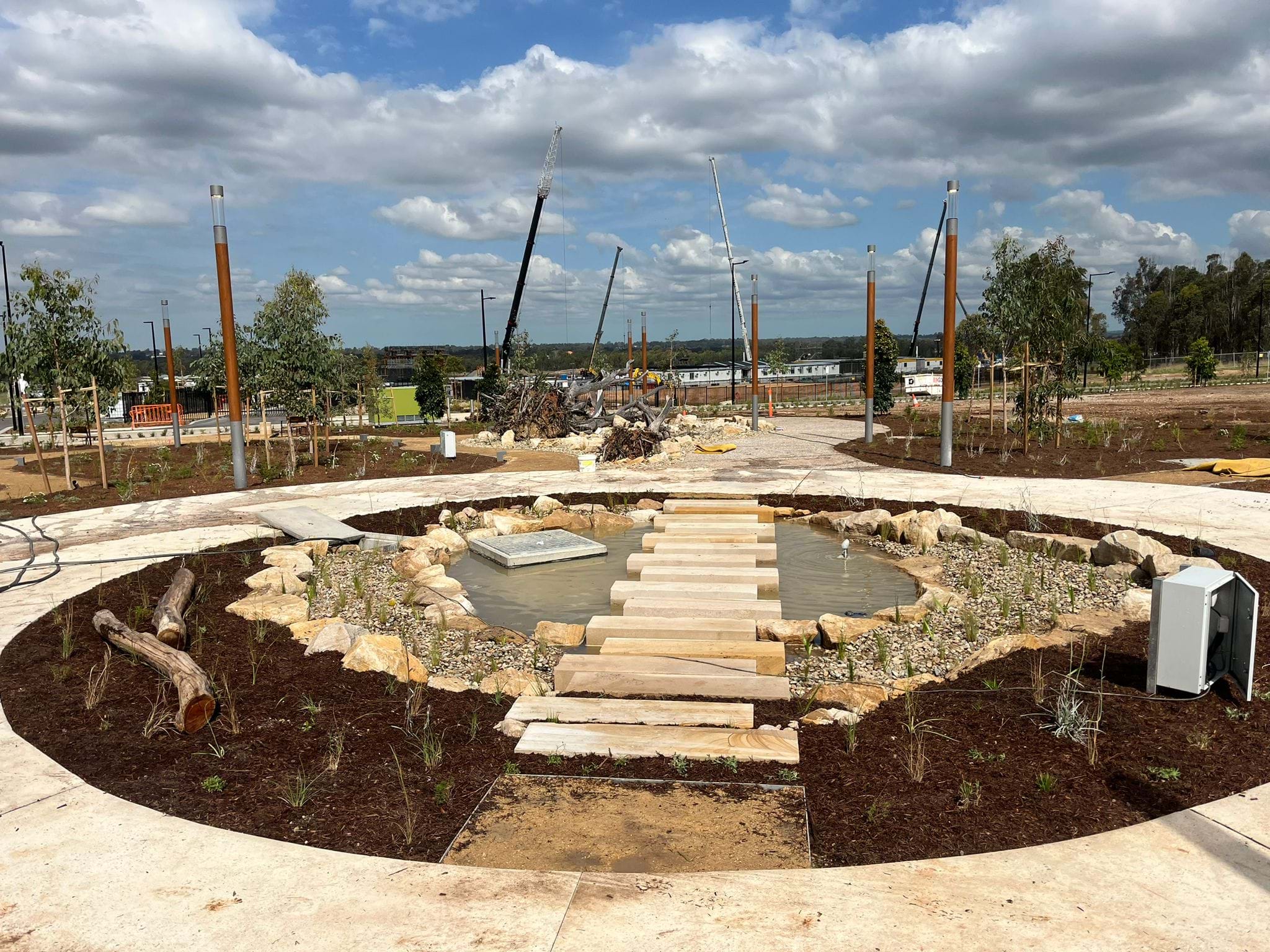 | JOB DESCRIPTION | Landscaping works for the 'First Building' in the new Bradfield City Centre consisting of mass planting over 130 native plant species through open park areas, with rammed earth seats and walls, water features, dry creek beds, planters and cultural gardens. |